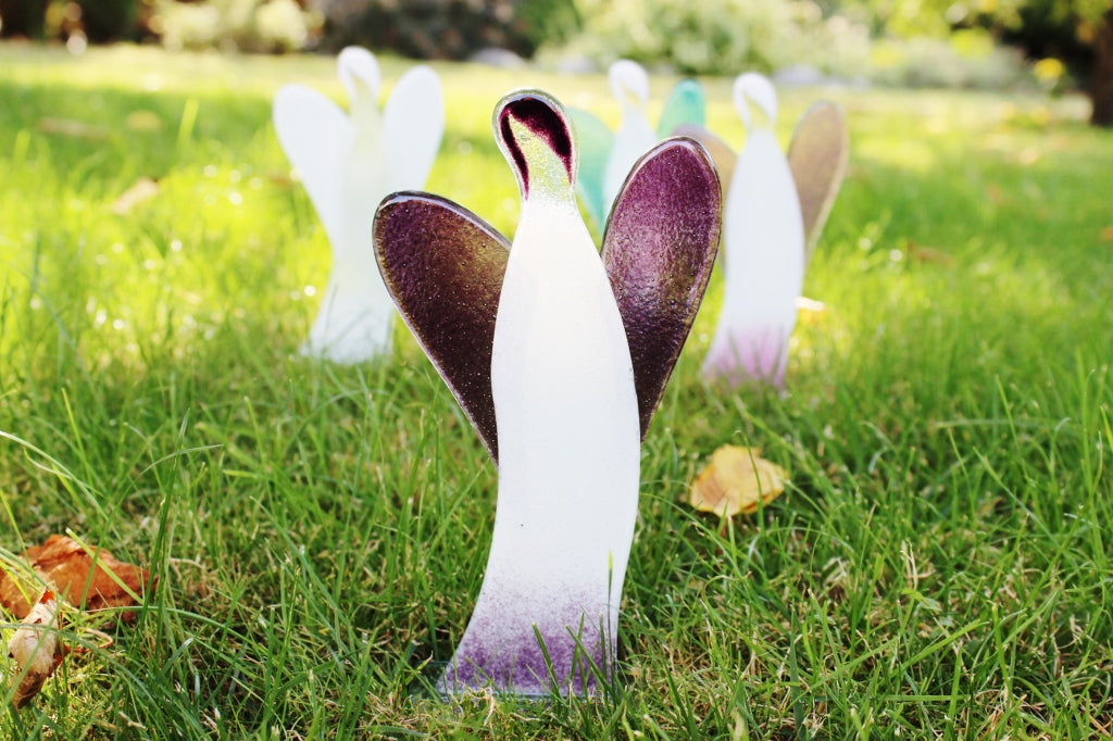 Bílo-fialový anděl skvěle ladí s šedými sametovými textiliemi, stříbrnými doplňky nebo bílými stěnami. Umístěte ho na konferenční stolek vedle svíček nebo na polici s rostlinami. Tato skleněná figurka je ideální dekorací do obýváku, která přitahuje pohledy a vytváří magickou atmosféru plnou harmonie.
