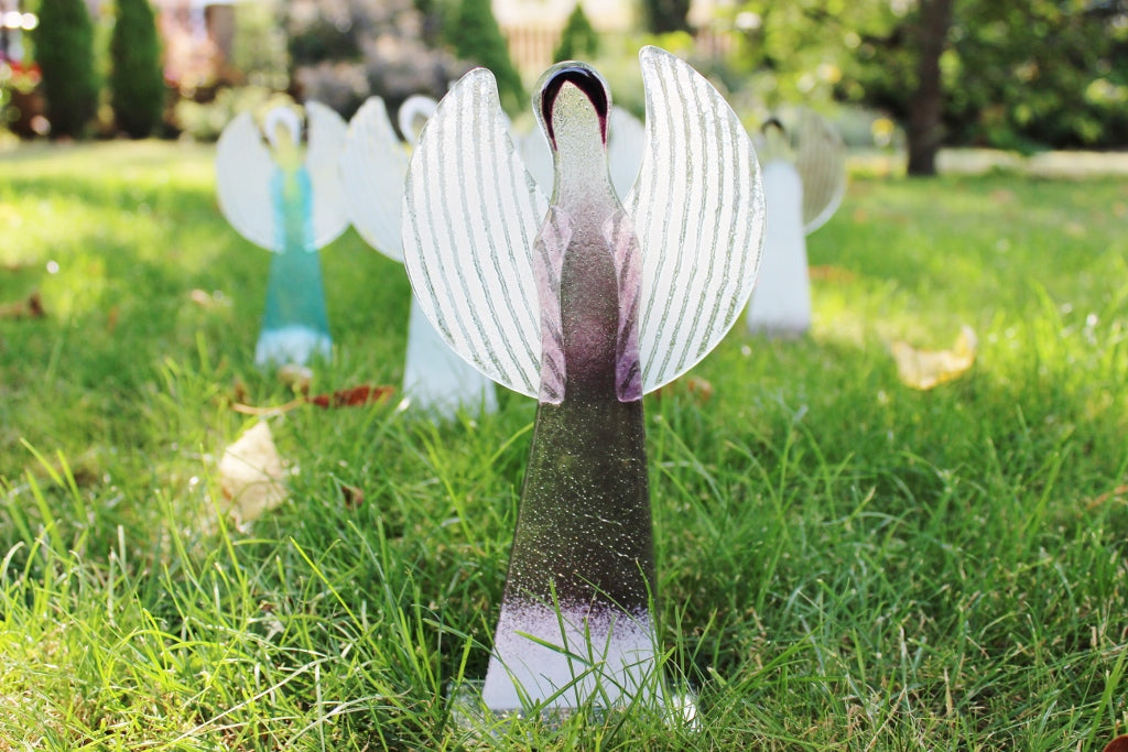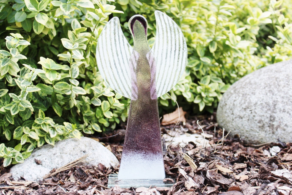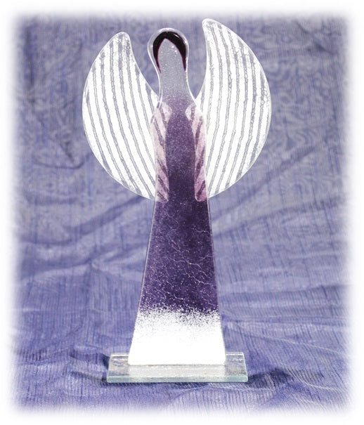 Fialovo-bílý anděl krásně vynikne s šedými sametovými polštáři, stříbrnými detaily nebo bílými stěnami. Postavte ho na jídelní stůl nebo na polici vedle svíček. Tato skleněná figurka je originální dekorací do bytu, která přitahuje pohledy a dodává vašemu domovu nádech elegance.